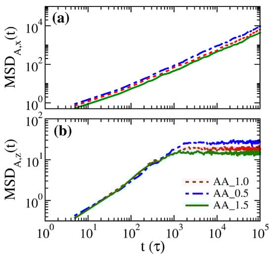 Mean square displacements of free particles in (a) the parallel direction and (b) the perpendicular direction for AA_0.5, AA_1.0, and AA_1.5 systems.
