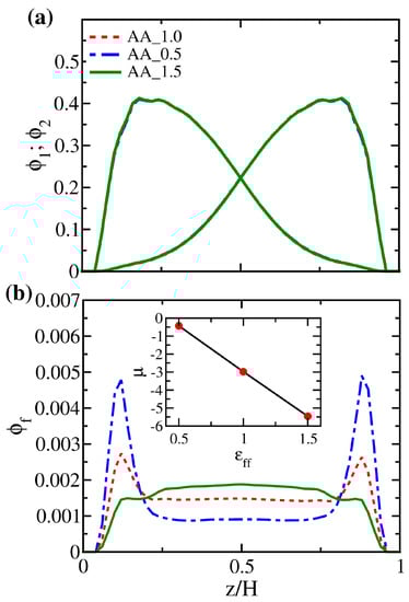 Although the local volume fraction distributions of polymer brushes for systems AA_0.5, AA_1.0, and AA_1.5 in Figure 9a are nearly indistinguishable, the corresponding distributions of free particles in Figure 9b differ significantly. Compared to system AA_1.0, the two dominant peaks near the wall in the distribution of system AA_0.5 are more pronounced, which means that free particles are more likely to stay in the proximity of the two walls instead of staying in the polymer-rich middle region. Conversely, the two peaks disappear in system AA_1.5, where the monomer-solute attraction is the strongest. We observe a higher plateau in the central region, allowing the free particles to mix with the polymers uniformly. Making use of the total free energy of the system in the dilute limit (), we present the variation of the solute chemical potential for the AA system in the inset of Figure 9b. For the range of considered, it is observed that the chemical potential is negative and decreases nearly linearly with . This behavior suggests that the affinity between polymers and solutes sets the reference state of the solvent capacity for brushes. In contrast, the entropic driving force defines the deviation of the solvent capacity for the reference state.