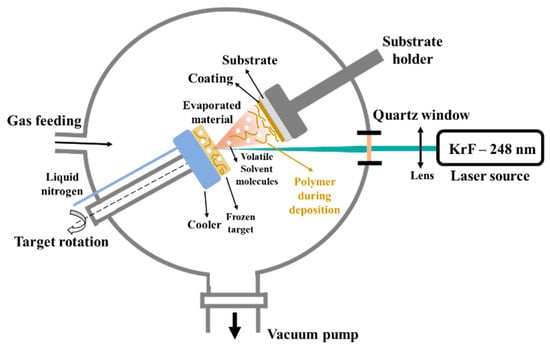 The ability to fabricate a variety of biomaterials in the form of thin films, with reasonably uniform material spreading over relatively large regions, controlled film thickness, and good substrate adhesion is one of the many benefits of laser-based technologies [18,19]. Matrix-assisted pulsed laser evaporation (MAPLE) is a deposition laser-based technique which involves low material consumption and preserves the stoichiometry of the growing layers [8,20]. From the laser deposition methods, MAPLE provides a mild transfer of small and large molecular weight species from the condensed phase into the vapor one. Specific to this technique, the organic material is dissolved in a volatile solvent before being frozen at N2 temperature. The photochemical degradation of the organic substance can be decelerated or even stopped by hitting the frozen target with a pulsed laser beam whose energy is absorbed by the solvent and turned into thermal energy [21,22,23].