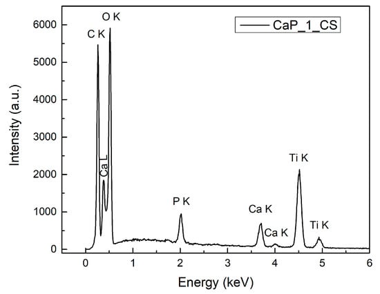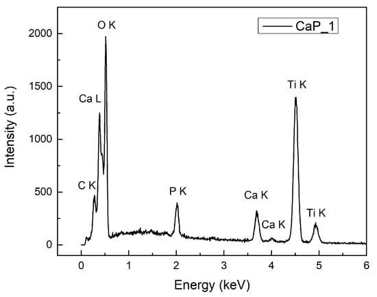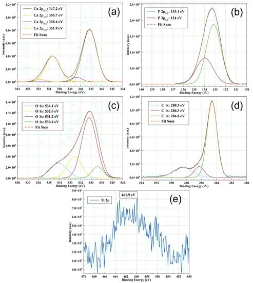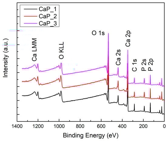The XPS survey spectra confirmed the presence of Ca, P, and O—chemical elements characteristic for CaPs, and Ti—from the substrate (see Figure 3).