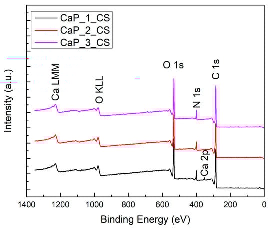 The results obtained after the XPS spectral analysis of CaP_1_CS, CaP_2_CS, and CaP_3_CS samples are presented in the following. The XPS full spectra (see Figure 5) of the analyzed samples indicate the presence of the elements specific to chitosan: C, N, and O and for CaP_1_CS sample the Ca 2p peak is visible.