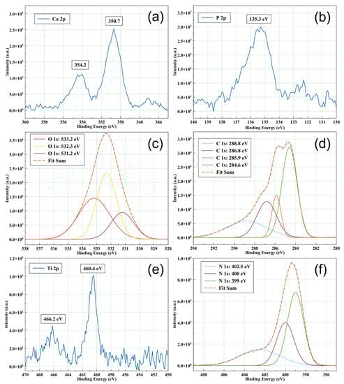 The high resolution XPS spectra of CaP_1_CS sample present the following lines: Ca 2p, P 2p, C 1s, O 1s, N 1s, and Ti 2p. The identification of Ca 2p (see Figure 6a) and P 2p (see Figure 6b) XPS lines indicate that the chitosan is embedded in the structure of CaP layer. The Ca 2p3/2 and Ca 2p1/2 lines are shifted to higher energies up to 350.7 eV and 354.2 eV, respectively. These shifts of the Ca 2p XPS lines indicate the oxidation of the surface [30]. The P 2p peak is centered at 135.3 eV (see Figure 6b) suggesting also the oxidation of the surface [31]. Moreover, the Ti 2p peak is also evidenced. The Ti 2p peaks which appear at 460.4 eV and 466.2 eV (see Figure 6e) were previously attributed to TiO2 structure [32].