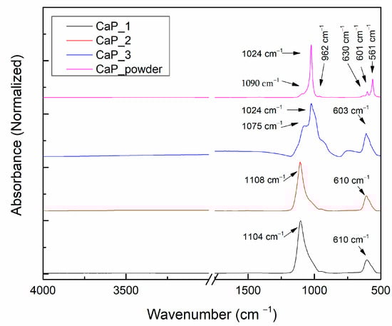 FTIR spectra of the CaP powder and of the CaP coatings deposited at different substrate temperatures (CaP_1, CaP_2, and CaP_3).