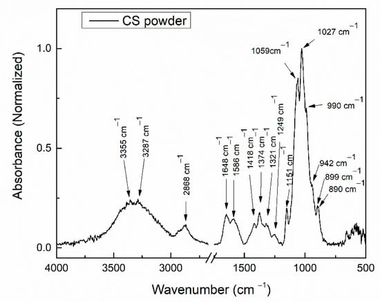 Absorption bands characteristic for chitosan were identified in the FTIR spectrum of the chitosan powder. A broad absorption band, with two maxima at 3355 and 3287 cm−1 could be assigned to the stretching vibrations of polymeric OH and to the stretching vibrations of N-H bonds [39]. The absorption band at 2868 cm−1 can be assigned to the asymmetric stretching of C-H [40,41]. The absorption band at 1648 cm−1 corresponds to the stretching of C=O of amide I [8,41], while the absorption band at 1586 cm−1 can be assigned to the bending of N-H [39]. The absorption bands at 1418, 1374, and 1321 cm−1 can be assigned to the bending vibration of C-H in -CH2 [41] and -CH3 [8,41], and C-N stretching of amide III [41], respectively.