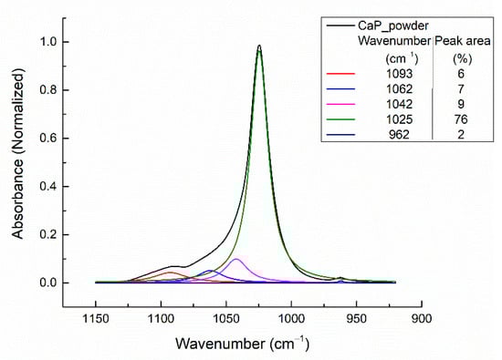 The deconvoluted IR bands of the CaP powder in the 1150–900 cm−1 spectral range and the peak area percentages are presented in Figure 9.