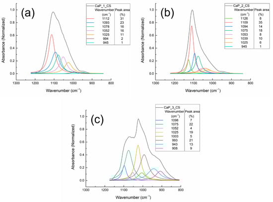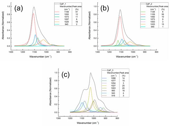 Deconvoluted FTIR spectra of the CaP coatings deposited at different substrate temperatures: (a) CaP_1, (b) CaP_2, and (c) CaP_3 in the 1300–800 cm−1 wavenumber range.