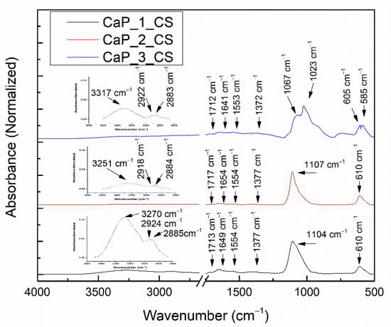 In Figure 11, the FTIR spectra of CaP_CS layers are presented. Table 4 indicates the IR bands specific to CS.
