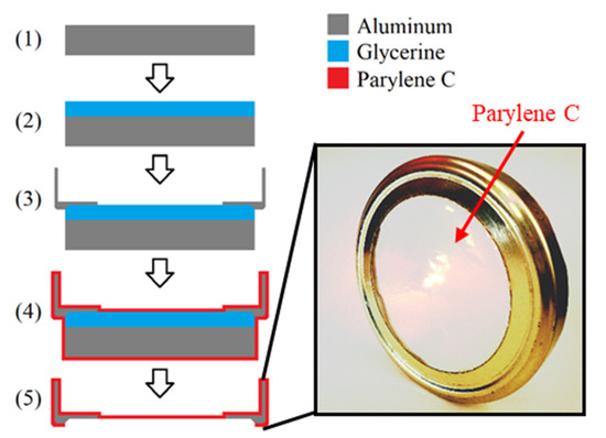 For the investigation of the impact of aging on the barrier properties, the chemical stability and the optical properties of Parylene C, large-scale free-standing circular membranes with a diameter d of 8.1 cm, were fabricated. The fabrication process is depicted in Figure 1 and explained in detail elsewhere [3]. It can be summarized by the following five steps: On an aluminum plate of ~9 cm diameter (1) liquid glycerine (Brenntag GmbH, Germany) was spin-coated at 1000 rpm for 10 s (SpinCoater CT62, SÜSS MicroTech AG, Germany). Next, a cap for a regular screw-top jar that has a hole for the Parylene membrane to be fabricated was placed on the glycerine-coated aluminum plate (3). Subsequently to this, the sample was coated with Parylene C by chemical vapor deposition (CVD) in accordance with the Gorham process depicted in Figure 2.