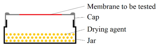 To realize the samples according to Figure 3, 100 g of pre-dried (for >2 h at 135 °C in air) silica gel (Engelhard Process Chemicals GmbH, Germany) was used as a drying agent (water absorption capacity: 36 g per 100 g silica gel) and filled into the glasses. The caps with the free-standing Parylene C membrane were screwed on the glasses filled with silica gel and sealed with gum paste (P.C. Flex Mask, smartTec GmbH, Germany) and self-vulcanizing rubber tape (Würth GmbH & Co. KG, Germany). For the measurements of the WVTR of Parylene C, the samples were placed in a climate chamber (CSR-60/600-5, CTS Clima Temperatur Systeme GmbH, Germany) with climate B of DIN 53,122 (38 °C and 90 %RH). The mass of each sample was determined daily over the storage time Δt of at least 14 days.