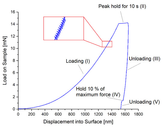 Applied load cycle for the nano-indentation measurements consisting of five parts: (I) increasing the load, (II) holding the maximum force, (III) decreasing the load until 10% of maximum force, (IV) holding 10% of the maximum force for 75 s, and (V) decreasing the load until zero.