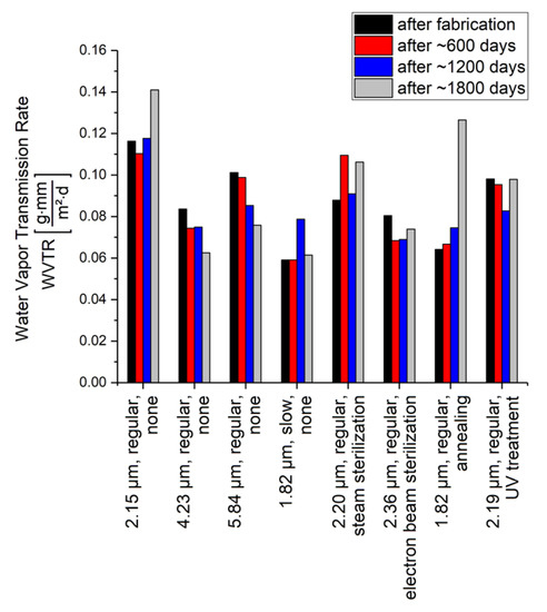 Results of water vapor transmission rate WVTR for the different samples and after fabrication as well as after ~600 days, ~1200 days, and ~1800 days of non-accelerated aging.