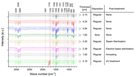 In conclusion of the spectra given in Figure 6, no difference is observed for all samples without post-treatment and, hence, no impact of non-accelerated aging up to ~1800 days. This is independent of the Parylene thickness and whether the Parylene is deposited by a regular or a slow process (130 °C and 100 °C sublimation temperature, respectively). These samples show an increase in the peak intensity with increasing thickness of the Parylene membrane due to more material transmitted by the IR laser beam.