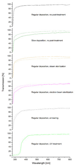 The obtained and post-processed UV-VIS spectra are depicted in Figure 7. The spectra of the samples with thickness variation only are not considered, since no deviation from the spectrum measured at the sample, which was deposited regularly and received no post-treatment, is expected. Due to the low dose during the measurements, it is unlikely that the samples will be altered by the UV-VIS measurement itself. Furthermore, and in case an alteration takes place during the measurements, due to the small spot size of the beam used in comparison with the large membrane, it is unlikely that during the different measurements performed on one sample at different times that the same sample position is measured twice.