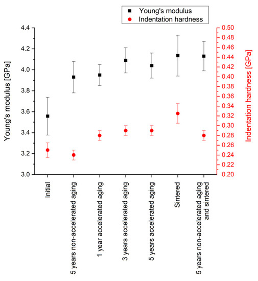 However, it is still noteworthy that within our experiments the material alteration can be observed for annealing temperatures lower than the temperature for long-term exposure of 125 °C given in the literature [44]. The increase in the indentation hardness could be due to recrystallization processes caused by increased temperatures and leading to a higher share of crystalline material in the regularly partly crystalline polymer [52]. In contrast to that, an impact on the unit cell of the crystalline domains is unlikely. For the different durations of accelerated aging, neither for the Young’s modulus nor for the indentation hardness a time dependency is observed.
