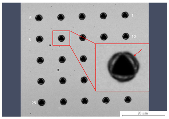 Light microscopic image of the nano-indents on Parylene C. The typical pile-ups (arrow) observed for soft materials is clearly visible.