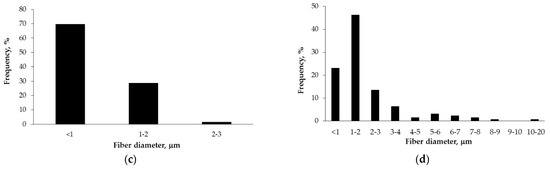 Structure and surface morphology of the materials were evaluated using scanning electron microscopy (SEM) with an aim of Phenom ProX (Thermo Fisher Scientific, Waltham, MA, USA) at 10–15 kV. The SEM images were processed using ImageJ software (version 1.52) to calculate the fiber diameter’s size distribution and local porosity [32,33].