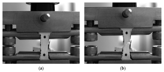The samples were also mechanically tested not only in a dry state but in a wet state to better represent the material behavior within the cell culture conditions. Macrophotos of the samples at the beginning and at the end of the deformation are shown in Figure 3, while obtained results of the mechanical testing are summarized in Table 2.