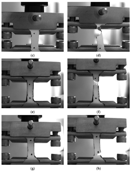 Photos of (a,b,e,f) EA-SBS and (c,d,g,h) ES samples in dry (a–d) and wet states (e–h) at the beginning and at the end of the mechanical testing.