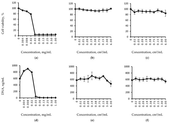 Relative cell viability (a–c) and DNA quantity (d–f) curves for sodium dodecyl sulphate (SDS) serial dilutions (a,d), and extracts of fibrous samples formed via (b,e) ES or (c,f) EA-SBS technique. SDS is used as a positive control.