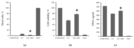 Relative biomaterials’ cytotoxicity (a), cell viability (b), and DNA quantity (c). 2D culture of NIH 3T3 cells in culture medium is used as a negative control, 2D culture of NIH 3T3 cells in 1 mg/mL sodium dodecyl sulphate (SDS) is used as a positive control. The sample formed by EA-SBS is marked with an asterisk.