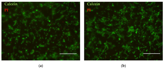 Live/Dead assay revealed no contact cytotoxicity, since after 48 h in culture a high number of green viable cells could be observed on all scaffolds with only a few dead red cells (Figure 6). Images were analyzed using imaging software ImageJ (NIH, Bethesda, MD, USA). The background noise was removed, and gamma multiplication was applied to highlight bright areas and to suppress the darkest areas. The particle analysis revealed 5% of dead cells in the electrospun sample, and 4% of dead cells in the sample formed by EA-SBS. The cells evenly spread within the scaffolds, forming a considerable number of cell–cell contacts; however, the number of cell–cell contacts was the highest for the EA-SBS sample (Figure 6b).