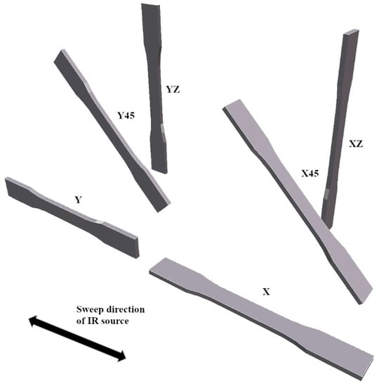 The specimens and their respective designations according to print orientation are presented in Figure 2. The length of horizontal specimens (X and Y), and therefore the direction of the tensile and compressive testing loads, have been aligned to the sweep direction of the IR source. Compression test specimens have a square cross-section. Therefore, they are identical when printed in the X and Y directions.