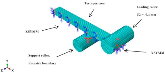 The calibrated material model was validated with a simulation of three-point bending test (Figure 3). The test specimen was modelled as 3D deformable solid using C3D20 elements. Only one quarter of the test specimen was modelled with symmetry across the XY (ZSYMM) and YZ (XSYMM) planes to reduce computational cost. Meshing was performed with a global seed size of 1 for a total of 1512 elements. The supports of the three-point bending test jig were modelled as 3D discrete rigid using R3D4 elements. Encastre (all DOF removed) boundary condition was applied on the support roller. U2 displacement of −9.4 mm was applied on the loading roller. Contact between the rollers and test specimen was modelled with a friction coefficient of 0.4.