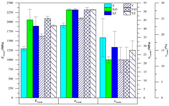The mechanical properties of AM PA12 were experimentally evaluated in tension and compression. We observe significant print orientation-dependent anisotropy in both tension and compression (Figure 4). In tension, specimens printed in the X-direction had the lowest values of ETensile and σTensile. Compared to the highest recorded values (Y45-direction), X specimens were approximately 40% and 20% lower in ETensile and σTensile, respectively. Y specimens had slightly higher values of ETensile and σTensile when compared to X-direction specimens. X45 and Y45 specimens had similar tensile properties and had displayed the highest values of ETensile and σTensile among the different orientations. XZ and YZ specimens also had similar tensile properties, with approximately 10% lower ETensile than X45/Y45 specimens. X45, Y45, XZ, and YZ specimens had displayed similar values of σTensile. X specimens have generally displayed the highest εTensile among the different orientations. Among the different studies in the literature, the overall trends in orientation-dependent tensile mechanical properties observed in this work most closely resembles the work by Riedelbauch et al. [].