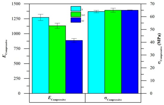 X specimens had the highest ECompressive, followed by X45 and XZ specimens (Figure 5). All three specimens displayed similar values of σcompressive. However, the compression tests were stopped due to buckling failures of the specimens rather than yielding, thus the test may not truly reflect the actual σcompressive limits.