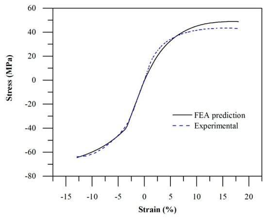 Based on the compressive stress–strain curve of AM PA12, the EPI material model that was applied in [] will not be able to accurately represent the material behaviour across the entire compressive and tensile strain range. This is because the EPI material model effectively assumes that the compressive stress–strain curve is identical to that of the tensile stress–strain curve, albeit in terms of compressive stress and strain. The stress–strain behaviour of AM PA12 was therefore modelled using the elastic–plastic with combined hardening (EPC) material model available in Abaqus. Material model parameters were calibrated against experimental tensile and compressive test data for specimens printed in the X-direction only. The FEA predictions are in good agreement with experimental results with a coefficient of determination (R2) of 0.94 (Figure 6).