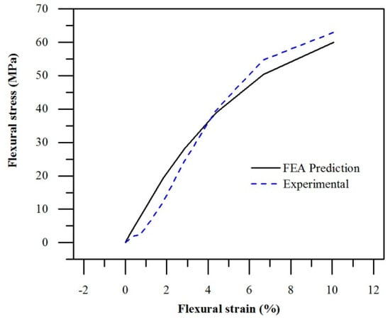EPC material model predictions compared to experimental three-point bending stress–strain curve (X-direction).