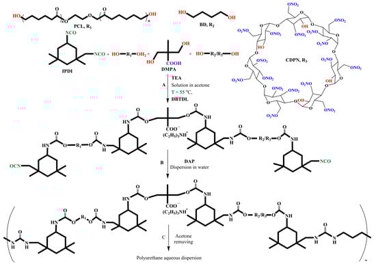 At the first step of the synthesis (A on Figure 1), DMPA, TEA, and acetone were placed in a flat-bottom flask with a ground neck and stirred with a magnetic stirrer at room temperature. When the reagents dissolved, PCL was added to the reaction mixture, which was stirred until the formation of a homogeneous mixture at T = 35 °C. The calculated amount of BD or CDPN was added. The reaction mass was cooled down to T = 25 °C, and IPDI and DBTDL catalyst were added to the reaction mixture. The moment of catalyst introduction was considered to be the start of the reaction. The urethane formation reaction proceeded upon stirring for 3 h at T = 55 °C. The conversion of isocyanate groups was determined by a standard di-n-butylamine titration method.