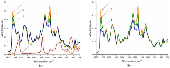 IR spectra for WPU films measured by ATR: (a) 1—sample 2.1; 2—sample 2.2; 3—sample 2.3; 4 –CDPN; (b) 1—sample 1.1; 2—sample 1.4; 3—sample 1.7.