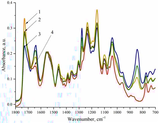 IR spectra for WPU films measured by ATR: 1—sample 1.1; 2—sample 1.2; 3—sample 1.3; 4—sample 2.2.
