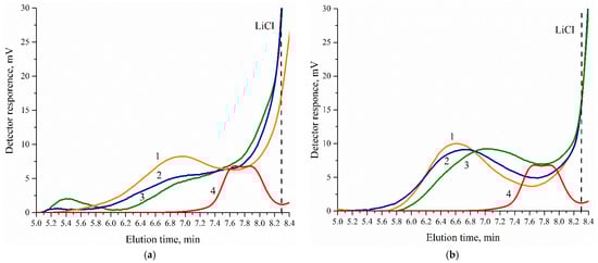 Chromatograms of WPU samples: (a) 1—sample 1.3; 2—sample 1.6; 3—sample 1.9; 4—CDPN; (b) 1—sample 2.3; 2—sample 2.6; 3—sample 2.9; 4—CDPN.
