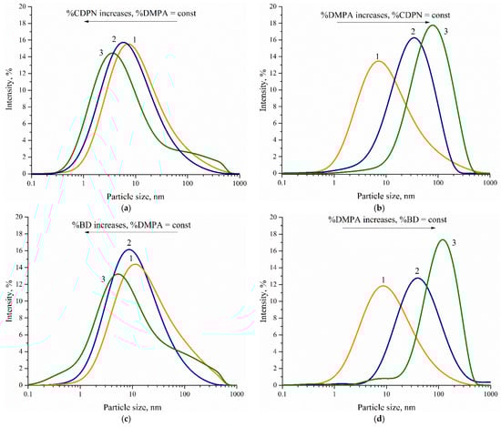 Series of samples 1.1–1.3, 1.4–1.6, and 1.7–1.9 should be considered when studying the effect of the mass fraction of CDPN on aqueous dispersion particle size. Figure 5a shows typical curves of the particle size distribution of the dispersed phase for samples 1.1–1.3. It is seen that the particle size value tends to decrease with increasing content of hard segments at a constant mass fraction of DMPA. However, the particle size of the dispersed phase of WPU increases along with the mass fraction of the hydrophilizing agent at a constant CDPN content (samples 1.1, 1.4, and 1.7; Table 4, Figure 5b). Similar dependencies of the particle size of the dispersed phase are observed for the series of WPU samples 2.1–2.9 (Table 4, Figure 5c,d).