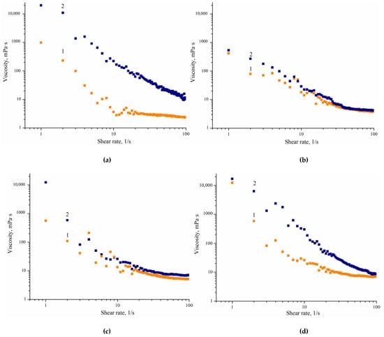 Viscosity of WPU dispersions as a function of shear rate: (a) 1—sample 1.1, 2—sample 2.1; (b) 1—sample 1.4, 2—sample 2.4; (c) 1—sample 1.7, 2—sample 2.7; (d) 1—sample 1.7, 2—sample 1.8.