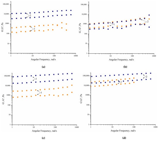 Frequency correlation of dynamic storage modulus G′ (solid squares) and loss modulus G″ (solid circles) for WPU dispersions (0.01% strain): (a) 1—sample 1.1, 2—sample 2.1; (b) 1—sample 1.4, 2—sample 2.4; (c) 1—sample 1.7, 2—sample 2.7; (d) 1—1.7, 2—sample 1.8.
