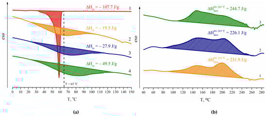 DSC thermograms for WPU films: (a) 1—PCL, 2—sample 2.1; 3—sample 2.4; 4—sample 2.7; (b) 1—sample 1.1; 2—sample 1.4; 3—sample 1.7.