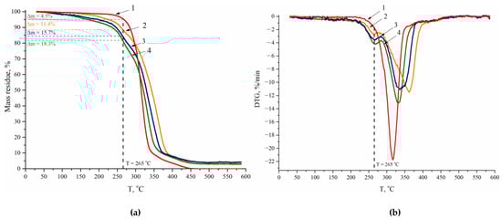 TGA (a) and DTGA (b) thermograms for WPU films: 1—sample 2.1; 2—sample 1.1; 3—sample 1.4; 4—sample 1.7.