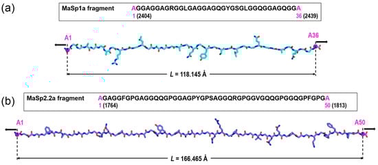 Figure 1 shows the two selected fragments, one from the spidroin MaSp1a and another from the spidroin MaSp2.2a, on which the MD calculations were performed. The sequence of each fragment is indicated, as well as its geometry upon assumption of an extended β-pleated secondary structure as the initial reference conformation and after initial cycles of energy minimization to optimize the structure (see below). Both sequences are available from NCBI GenBank (Accession numbers MaSp1a (ON722379) and MaSp2.2a (ON722372), and the whole sequences are presented in Supplementary Figure S1. Each fragment corresponds to one of the largest regions among the set of repetitive fragments found in the central core of each selected spidroin. For consistency, both fragments start and end with an alanine residue that actually belongs to the adjacent polyalanine motifs found at the ends of each polyglycine-rich fragment. The MaSp1a fragment comprises 36 amino acids (including the two alanines at the ends) with a total length of 118.1 Å measured between both end Cα atoms in the optimized geometry of the completely extended β-pleated conformation, and the MaSp2.2a fragment comprises 50 amino acids with a total length of 166.5 Å in the same fully extended conformation.