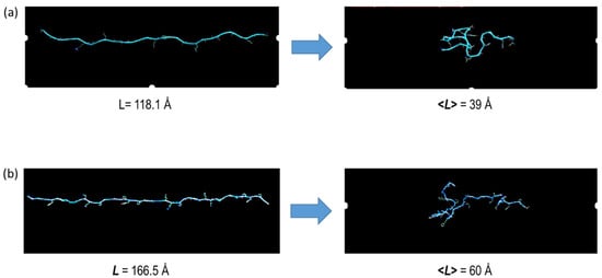 The initial structure of all the MD calculations on each fragment was the optimized reference extended β-pleated conformation equilibrated at 298 K. The distance between the Cα atoms at both ends, L (Figure 1) is thus the maximum length of each fragment. Then, the evolution of L was recorded over the 20 ns MD simulations in the absence and in the presence of external force. In all cases, equilibrium states were reached at different simulation times depending on the force applied. These states were assessed by following the evolution of the root mean square deviation (RMSD) computed for the superposition of backbone atoms in the structure of each trajectory frame with those in the initial structure. The stabilization of the RMSD variation in each trajectory was taken as a direct indication of equilibrium. In the absence of external forces, both MaSp1a and MaSp2.2a fragments tend to shrink dramatically, showing great variations of the RMSD with large standard deviations indicative of a considerable flexibility. This flexibility is manifested in large standard deviations of the L distance measured along the trajectory; a result found in three independent simulations of the fragments in the absence of external force (Table 1). The relationship between the initial reference conformation and the equilibrium conformation (reached at about 10 ns in the absence of external force in the three trajectories) is illustrated in Figure 2, where the arithmetic mean of the L distance (Table 1) is indicated. The evolution of the process is presented for one representative trajectory of each fragment as videos in Supplementary Materials Video S1.