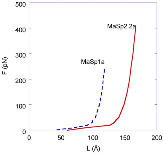 These results are summarized in Figure 3, which plots the external force applied vs. the average distances L. The curves in Figure 3 start at the initial average equilibrium distance between the ends of the fragments in the absence of external force (39 Å for MaSp1a and 60 Å for MaSp2.2a; see Table 1) and extend to the maximum length of both fragments that correspond to the structures at which they are studied: the extended β-pleated conformation, since no other secondary structure geometry can have a longer length associated with a chain formed by peptide groups. The maximum 118.1 Å length for MaSp1a is reached at an applied external force of 250 pN, and the maximum 166.5 Å length for MaSp2.2a is reached at an applied external force of 400 pN (see Supplementary Table S1). It is assumed that the chain will break upon reaching its maximum length, as conventionally considered in the modeling of elastomers [36,37]. However, this breaking process necessarily involves the breaking of covalent bonds in the polypeptide chain and cannot therefore be modeled by MD calculations. In this regard, molecular dynamics is defined by the equations of motion of all the atoms in a molecular system (34,165 for MaSp1a-water and 45,432 for MaSp2.2a-water), so that space positions, velocities, forces, accelerations, and energies are computed for all the atoms at all the computational steps (10 million for each trajectory of each fragment in the current work) along the trajectory. The values of all these magnitudes are obtained by numerically integrating the equations of motions during the simulation time used for following the dynamics of the system, but MD is a classical, not quantum, mechanics framework, and formation or breaking of covalent bonds cannot then be addressed as both processes involve electron rearrangements only tractable through quantum methods.