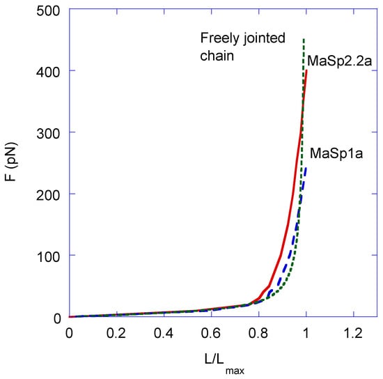 From Figure 4, it is apparent that the simulated curves are remarkably similar both qualitatively and quantitatively, albeit the MaSp2.2a fragment exhibits larger values of force at all values of L/Lmax. This difference is especially evident when comparing the maximum force reached by both fragments in the fully extended conformation: FMaSp2.2a, max = 400 pN and FMaSp1a, max = 250 pN. In this figure, the theoretical curve obtained by applying Equation (1) with a value of a = 8.1 Å is also represented. From this comparison, the excellent agreement between the theoretical curve and the curve obtained from the MD analysis of the MaSp1a fragment is apparent. The similarity between the theoretical curve and that obtained from the MD analysis of the MaSp2.2a fragment is also remarkable, although larger differences are found when comparing the numerical values of both curves.