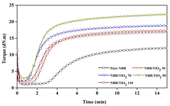 Cure curves of TiO2-filled NBR composites with various TiO2 loadings.