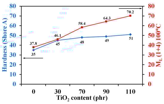 The viscosity of the compound and stiffness of the vulcanizes are indirectly reflected in the minimum torque (ML) and the maximum torque (MH), respectively. With increasing TiO2 content, ML displayed an increasing trend because TiO2 particles obstructed molecular mobility with increased friction and high resistance to flow. However, ML tended to decrease at 110 phr of TiO2 content as a result of filler agglomeration. Figure 2 shows the correlation between the hardness of NBR filled with TiO2 and viscosity. It is seen that TiO2-filled NBR composites exhibited much higher viscosities than virgin NBR due to the hydrodynamic effects of filler, filler–filler interactions, and filler–rubber interactions []. Moreover, the Mooney viscosities of TiO2-filled NBR composites increased from 37.8 to 70.2 MU with TiO2 loading, since an increased number of solid particles in the soft matrix caused more movement restrictions [].
