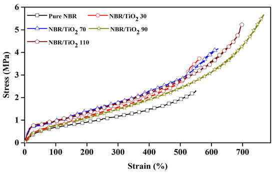 Stress–strain behavior of TiO2-filled NBR composites with various TiO2 loadings.