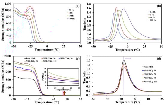 (a) Storage modulus, and (b) tan as functions of temperature for pure NBR at several frequencies; (c) storage modulus, and (d) tan as functions of temperature for TiO2-filled NBR composites with various TiO2 loadings at 1 Hz.