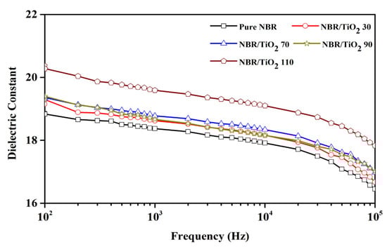 Figure 6 displays the dielectric constant versus frequency for different TiO2 loadings in NBR composites. There is a noticeable reduction in dielectric constant with frequency from 102 to 105 Hz in all cases because the electrical polarization is harder to follow at a higher frequency []. The maximum (~18.83) for pure NBR was observed at 102 Hz because of strong contributions from interfacial and dipolar polarization in the low-frequency range []. The high dielectric constant of pure NBR was due to the orientation polarization of the -C≡N dipoles. On increasing the frequency to 105 Hz, the dielectric constant decreased. This might be because the dipoles are incapable of reorienting rapidly enough to follow the applied frequency. With the introduction of TiO2, the dielectric constant of TiO2-filled composites increased with increasing TiO2 content because TiO2 has a higher dielectric constant than pure NBR. The 110 phr TiO2-filled composites showed the highest dielectric constant of 20.28 at a frequency of 102 Hz. Furthermore, the increased dielectric constant was partly attributed to better dipole orientation polarization due to the segment arrangement of rubber chains []. After the incorporation of TiO2 filler, the composites had more interfaces enabling interfacial polarization [].
