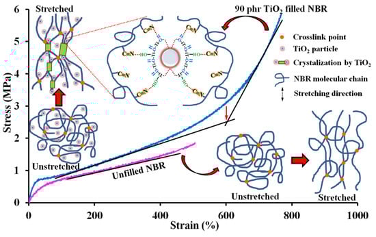 Figure 3 displays the stress–strain curves of the NBR composites. Pure NBR exhibited the lowest stress–strain curve with elongation at break ~550%, and without self-reinforcing behavior due to the irregular random copolymer structure, leading to insufficient mechanical properties []. It was found that the stress steadily increased with applied strain and then escalated sharply for TiO2-filled NBR composites. The abrupt increase in stress was observed at a high strain (>500% strain), especially with 90 phr TiO2 content, as opposed to the unfilled NBR composite that did not show strain-induced crystallization. The strain at the onset of the stress upturn corresponded to the onset of crystallization []. In the presence of TiO2, stronger chain alignment in the strain direction was caused by the additional crosslinks created by filler–rubber interactions [], as seen in Scheme 2. This corroborates that the NBR molecular chain orientation was assisted by TiO2 particles, to perform interfacial crystallization during stretching. Moreover, TiO2-filled NBR composites showed an increased slope of the stress–strain curve compared to pure NBR, indicating stiffening. This matches the responses in MH and hardness discussed earlier.